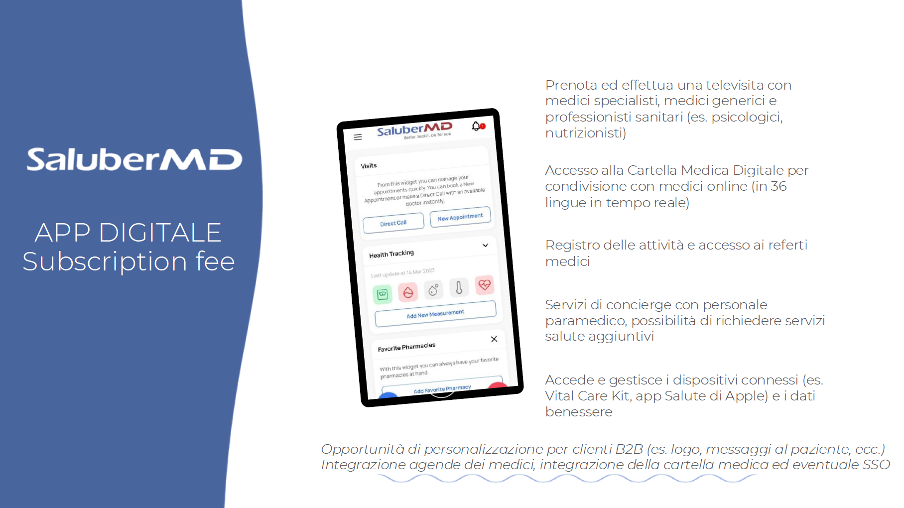 1. Voucher per accedere ai servizi di medicina digitale da fruire per il tramite dell’applicazione SaluberMD (su Apple Store o Google Play Store) per la durata di 12 mesi. Il servizio include:
