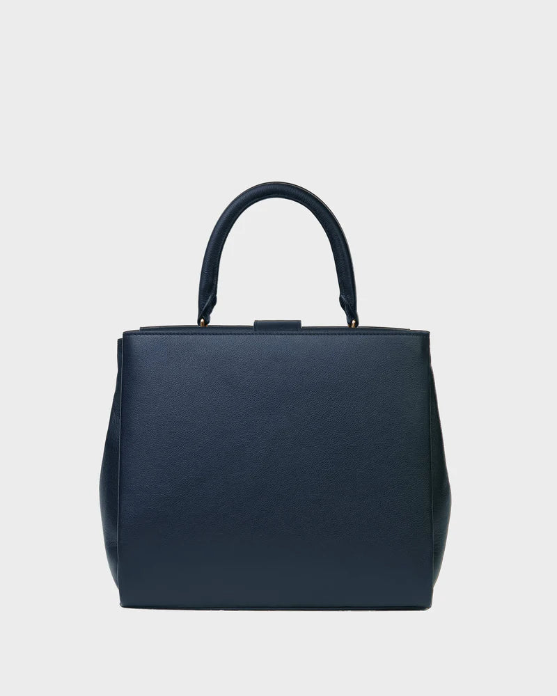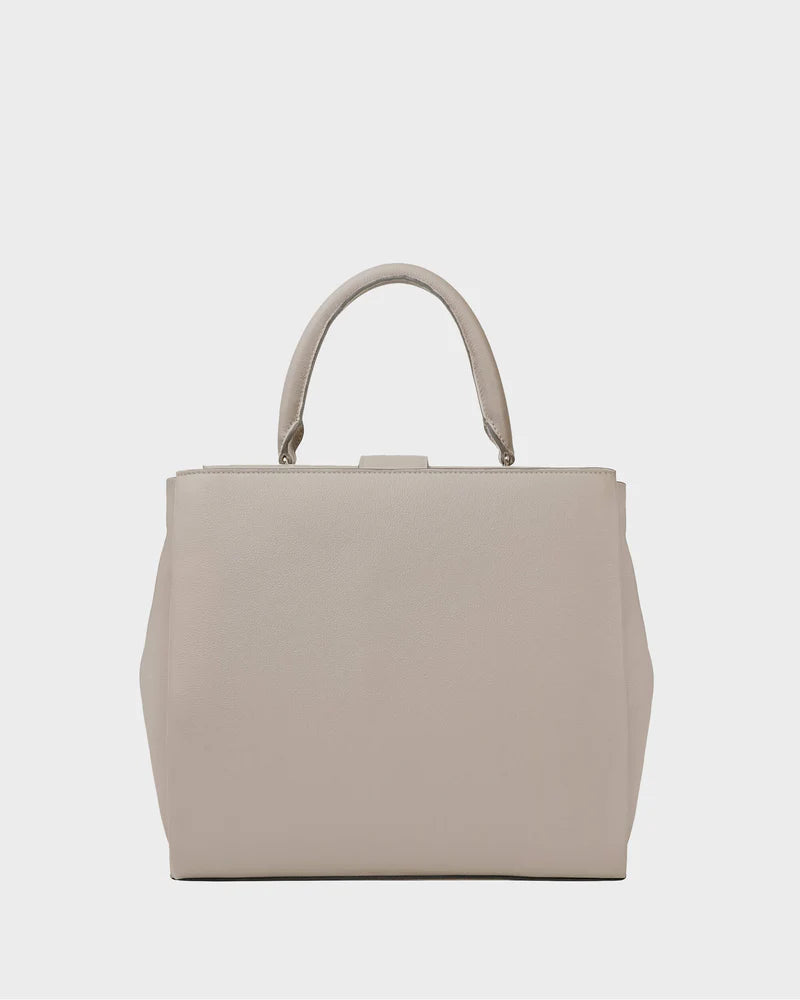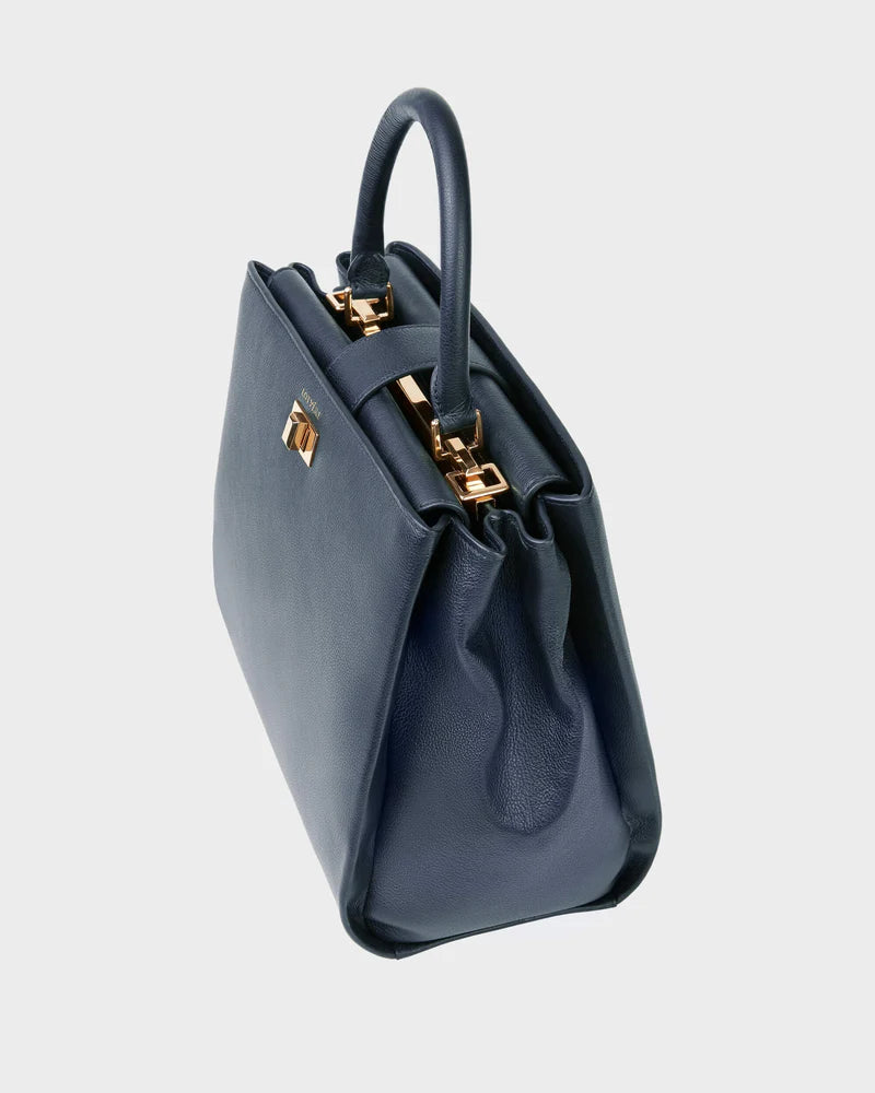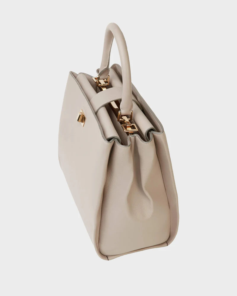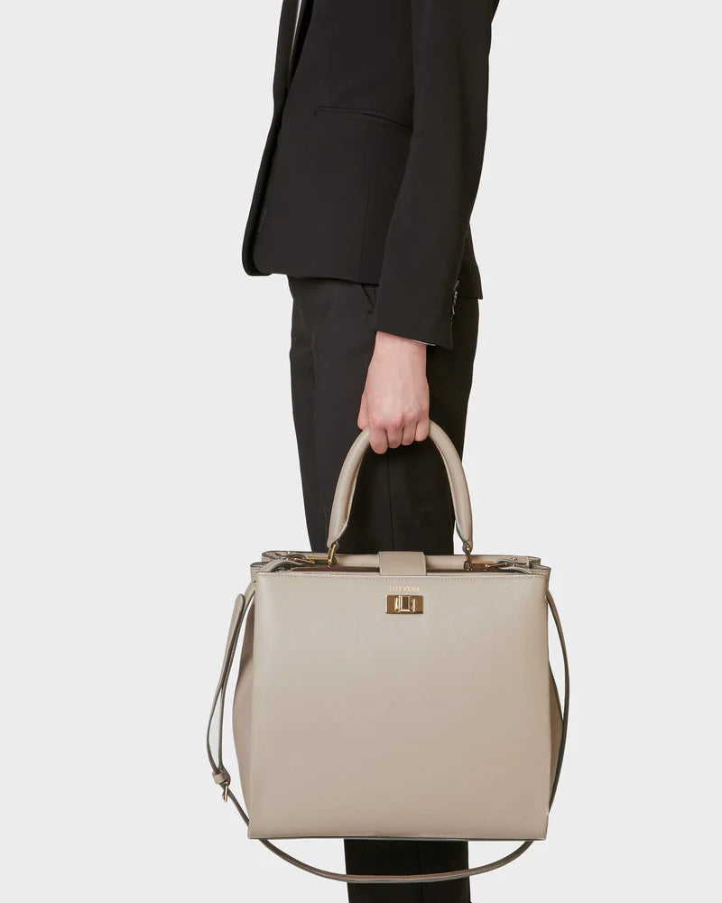 Multi-compartment handbag characterized by a central metal bar with gold plating and a turn-lock closure, it can be carried by hand or as a shoulder bag. Elegance and refinement blend with versatility and ample space, with well-measured compartments inside.